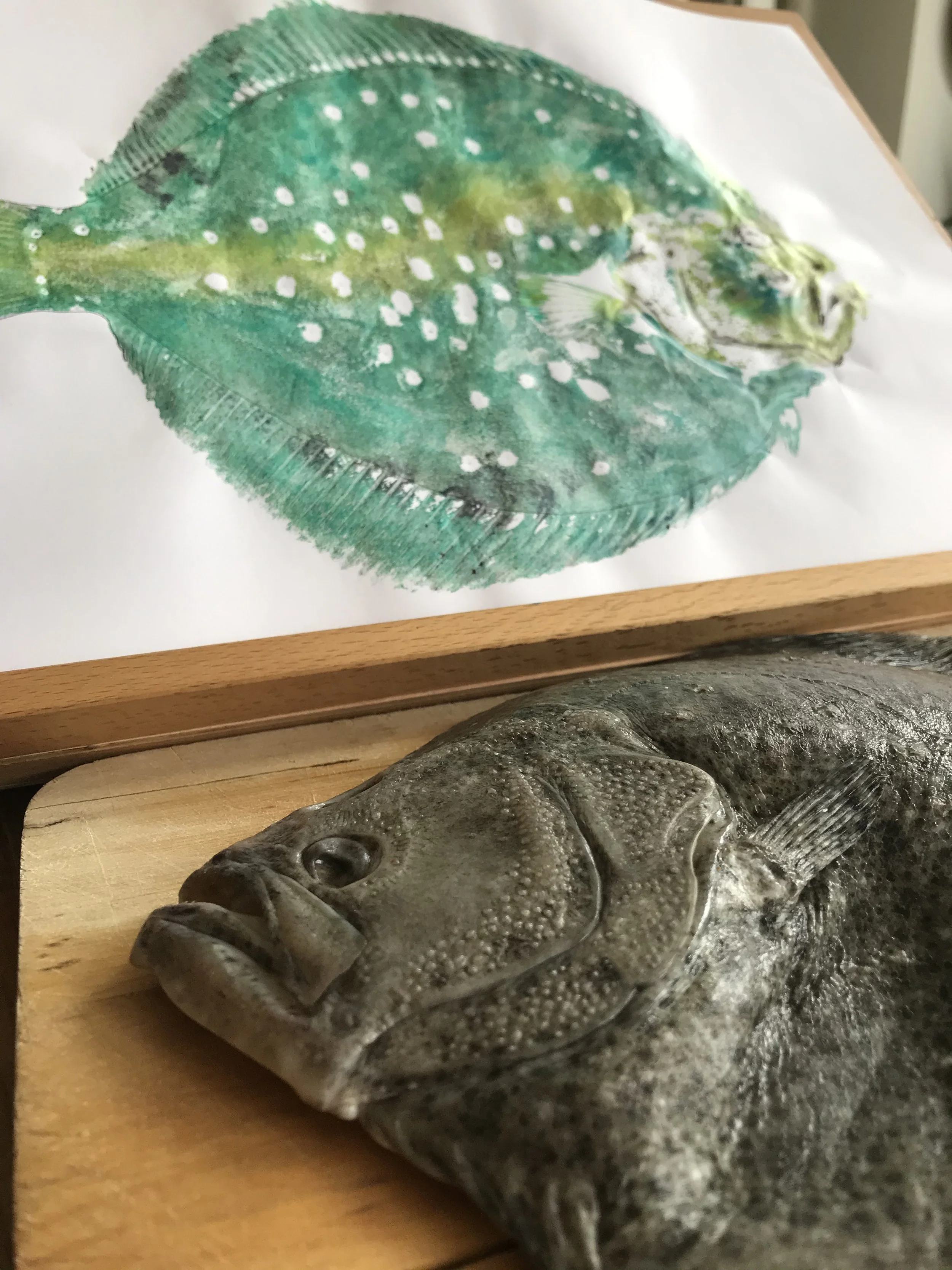 This turbot was hauled in along the sandy, gravelly shores around Cornwall and the Isles of Scilly, where traces of historic shipwrecks litter the seabed. Though smooth and scaleless, its head and body were studded with bony nodules that steadfastly resisted my paint. Inspired by this “King of Fish”, I created alternative colourways to surprisingly different effect; each depicting its character and natural environment.