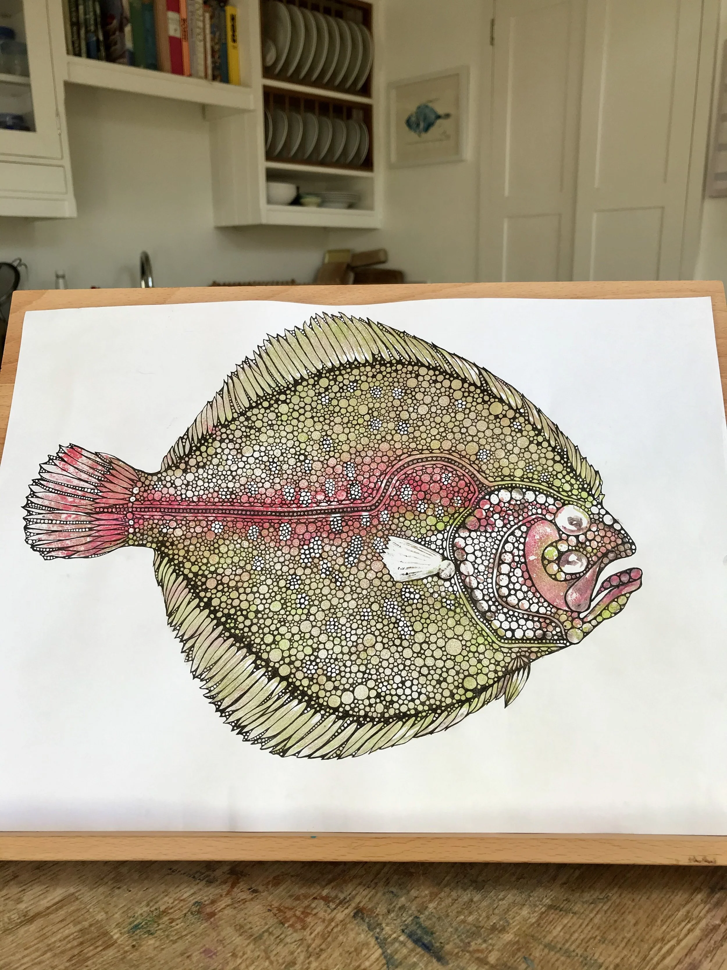 This turbot was hauled in along the sandy, gravelly shores around Cornwall and the Isles of Scilly, where traces of historic shipwrecks litter the seabed. Though smooth and scaleless, its head and body were studded with bony nodules that steadfastly resisted my paint. Inspired by this “King of Fish”, I created alternative colourways to surprisingly different effect; each depicting its character and natural environment.